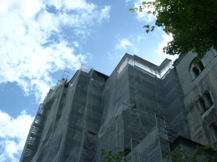 There is renovation work being done at Castle Neuschwanstein. The arrangement of scaffolding around the castle is very interesting.